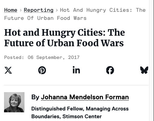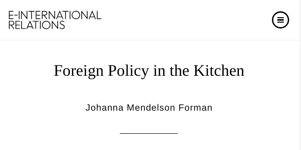 Articles & News Food, Conflict, and the Weaponization of Food Trump Can Work Dinner Table Deals Without Leaving Home The American Debate Over the Role of Food in Diplomacy On Food & Education: Johanna Mendelson Forman The Politics of Food and the 2024 US Election Kitchen diplomacy: how governments use food as a soft power Protests Are an American Tradition. But Why at Restaurants? Food diplomacy, sustainability, chef roles, and culinary heritage A Refugee’s Hope Away From Home The Other Korean War Dining with the Enemy in Iraq, Revisited Elevating Gastrodiplomacy’s Role in Marketing Identity Dining Under the Drones in Ukraine On Turkish Coffee and Gastrodiplomacy The Borsch War is Over Analysis | A global food meltdown? War has brought the world to the brink of a food crisis A hungry America needs new food for thought Ukraine’s Borsch Diplomacy Analysis | Can food build peace? Seven Ideas to Address Hunger and Climate Change Climate Change Is Hampering Our Ability To Combat World Hunger Noble Nobel: The World Food Program Ensuring the Future of Food Security ‘Breakfast Club’ Is Cheapest for Swiss, Most Expensive in Africa Is the Kitchen the New Venue of Foreign Policy? Exploring the Nexus of Food Security and National Security Cooking up a New Life: How Refugees Use Cooking to Thrive Food As Diplomacy At The Embassy Chef Challenge Diplomacy on the menu: How food can shape politics 5 Food Trends That Are Changing Latin America In Defense of Food Security Roundtable Reports Haitians South of the Border: A Tale of Two Cities Can a Hamburger Build World Peace? This College Course Teaches Students About War and Peace Through Food Hot and Hungry Cities: The Future of Urban Food Wars To promote kimchi abroad, Korean scientists are trying to get rid of the smell Educating the Next Generation of Military Leaders on Food Security Travel ban only feeds our fears Are We Headed Toward “Recurring Storms” of Global Food Insecurity? Making Food Security a National Security Priority Food as a Tool for Peace Foreign Policy in the Kitchen War Complicates Food Aid Delivery Seven Questions with Dr. Johanna Mendelson Forman, Creator of Conflict Cuisine Kitchen as the New Venue of Foreign Policy How Syria’s Famous Aleppo Pepper Might Be Saved Under The Tables: For A Different D.C. Experience, Take A Food Tour Mentoring the Next Generation of Immigrant Chefs: Meet Ben Velasquez In face of refugee crisis, it’s time for national conversation about identity Good Governance Is the Only Real Way to Provide Food Security The American History Museum Launches Food History Weekend October 22 What Are Conflict Cafes and Can They Actually Change the World? Conflict Cuisines: Central American Cooking Is Thriving On 14th Street A new beginning in US-Cuba relations still depends on Congress Why everyone should stop calling immigrant food ‘ethnic’ Conflict Cuisines: Celebrating Cuban Cuisine in D.C. Should Food Security be a National Security Issue? Conflict Cuisines: A History of Ethiopian Food In D.C. An Introduction to Washington’s Conflict Cuisines Four Corners: Habesha Market and Carry-Out Breaking Bread: Studying Conflict Cuisines in Washington, D.C. Conflict Cuisine: Teaching War Through Washington’s Ethnic Restaurant Scene